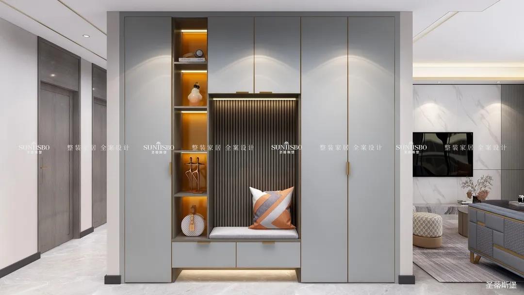 开门即见宽敞实用的玄关柜体。暖黄色的灯带,不仅增加了室内环境的层次感,更是创造了隐形的光环境。