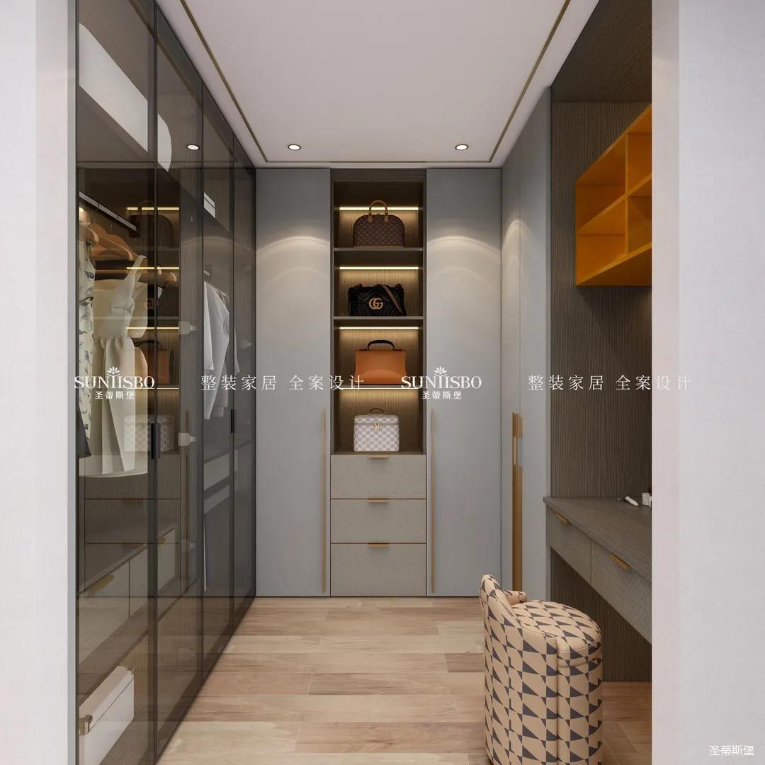衣帽间选择浅灰作为空间主色调,设计师在衣帽间用与整体空间相似的爱马仕橙作为点缀,使空间具有“简于形,奢于心”的时尚审美内涵。