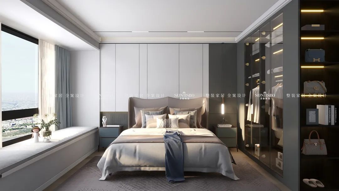 原色的木地板、浅灰的衣柜,搭配简约的背景墙,整个空间都呈现着祥和静谧的氛围。游走的光影,绝佳的开阔视野,使得空间充满无限张力。黄绿拼接的窗帘,配合柔和的层板灯,营造舒适温馨的起居氛围。
